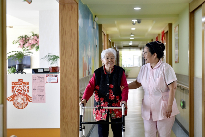 2024年5月25日,在山东省日照市东港区石臼街道日照幸福护理院,工作人员在陪护老人。