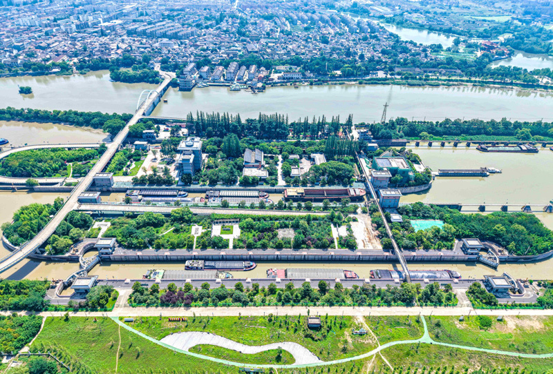 2025年7月4日,船舶有序通过京杭大运河扬州段邵伯船闸(无人机照片)。