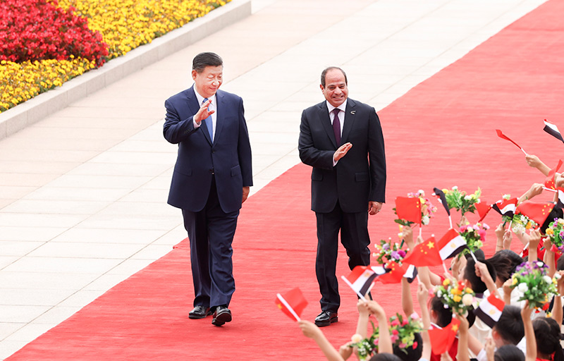 塞西抵达时,礼兵列队致敬。两国元首登上检阅台,军乐团奏中埃两国国歌,天安门广场鸣放21响礼炮。塞西在习近平陪同下检阅中国人民解放军仪仗队,并观看分列式。