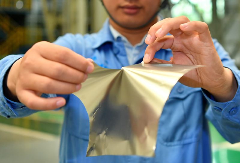 在位于山西的太钢集团,员工展示用手撕开0.02毫米厚的超薄带状不锈钢(2019年5月24日摄)。