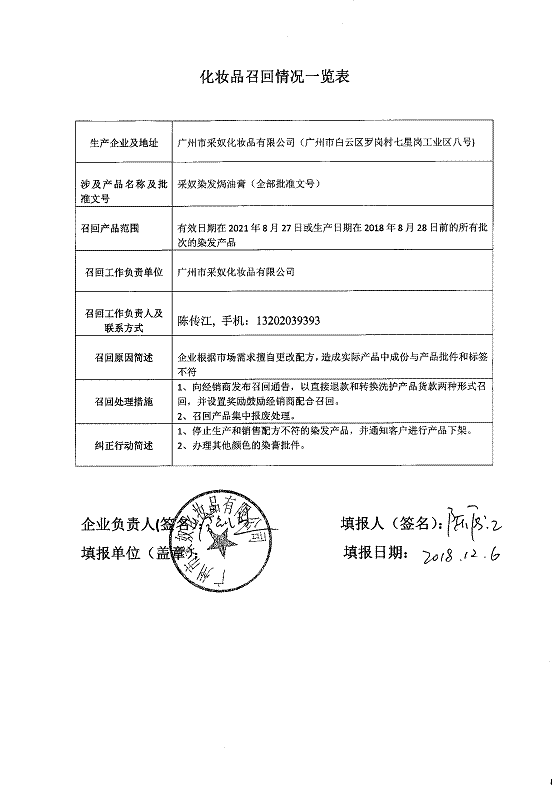 广州市浩鑫精细化工有限公司、广州市采奴化妆品有限公司、广州市艾娜斯化妆品有限公司3家化妆品生产企业因生产不合格化妆品被原国家食品药品监督管理局通报。上述企业已对不合格产品实施了主动召回,但仍有部分存在安全隐患的产品无法完成召回。经企业排查并报告我局,决定对存在安全隐患的产品实施全面召回。现将有关产品信息予以通告,具体内容详见附件。