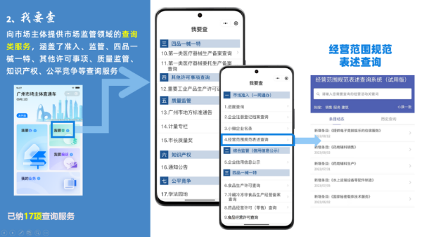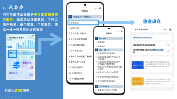 “广州市场主体直通车”中的“我要办”版块在线办理21项服务,“我要查”版块在线查询17项事项。