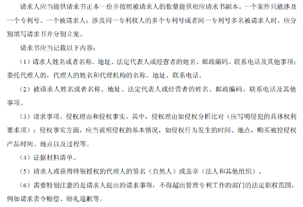 2.根据国家知识产权局《专利侵权纠纷行政裁决办案指南》(2019年12月)第二章第一节“案件受理与审查”的要求,请求书应当符合下列要求: