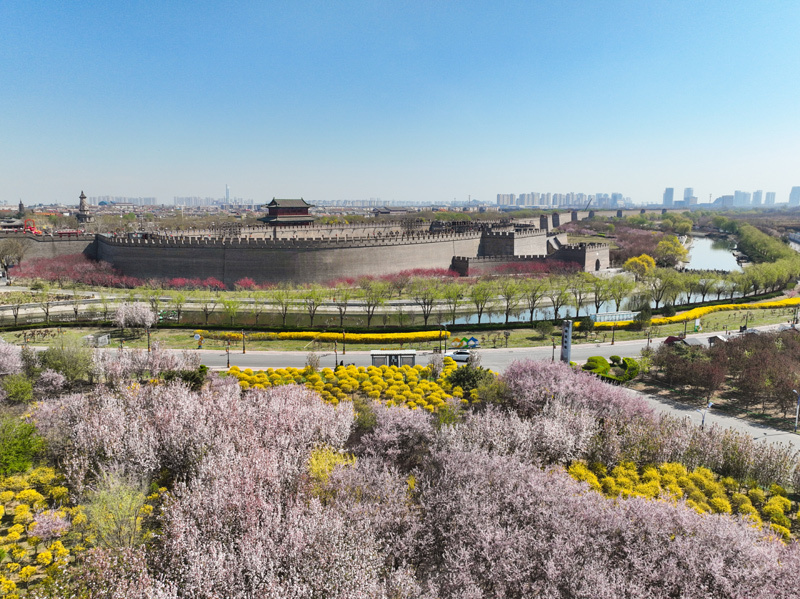 河北省正定古城南城门春色(2025年3月31日摄,无人机照片)。