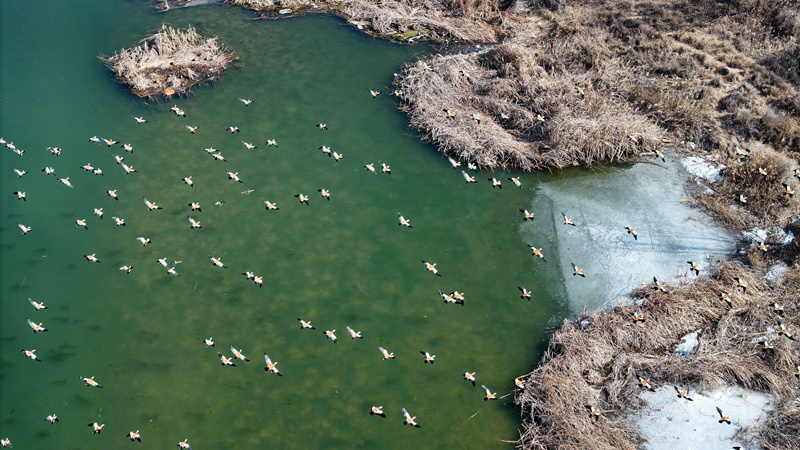 候鸟在黄河宁夏段一处湿地栖息、觅食(2025年2月26日摄,无人机照片)。