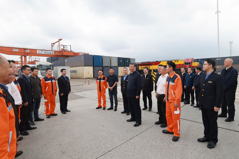 4月22日至24日,中共中央总书记、国家主席、中央军委主席习近平在重庆考察。这是22日下午,习近平在重庆国际物流枢纽园区重庆铁路集装箱中心站,同货车司机、列车司机、装卸工人、场站管理人员等亲切交流。