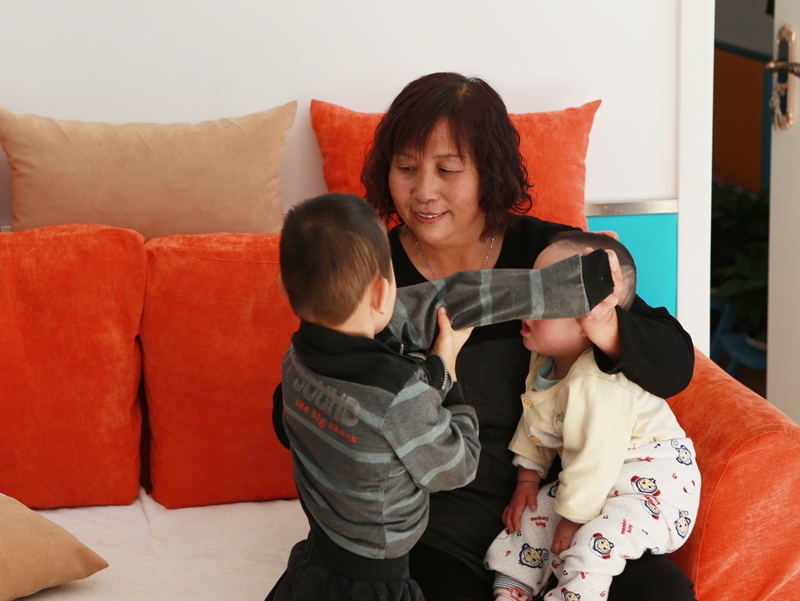 2017年11月3日,内蒙古呼和浩特市儿童福利院里,“爱心妈妈”景凤英抱着两个孩子。
