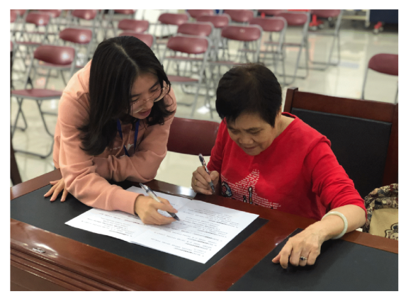 课题组工作人员深入海珠区瑞宝社区给居民代表讲解问卷调查填写事宜
