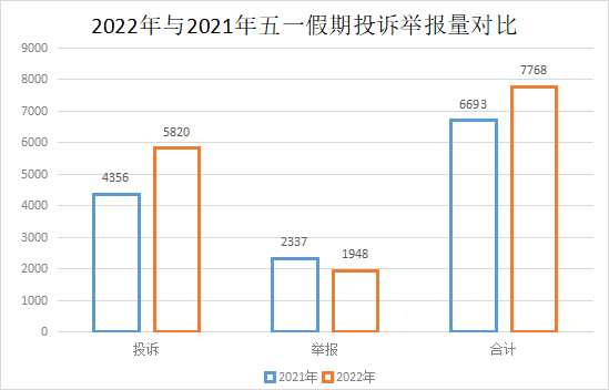 五一小长假(4月30日至5月4日),全市消费市场总体平稳有序,全市市场监管部门通过全国12315平台和广州12345热线系统共接到消费投诉举报工单7768件,同比去年五一假期增长16.06%。其中,投诉5820件,举报1948件。