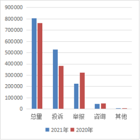 2021年共接收处理举报工单22.6万件,占工单总量的28.1%。