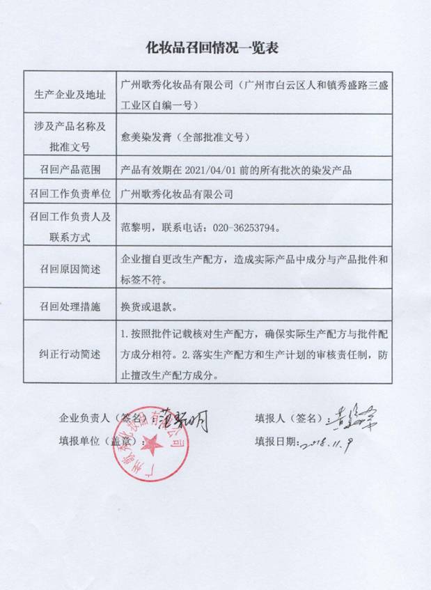 广州市瑛派儿化妆品有限公司、广州歌秀化妆品有限公司、广州市发歌精细化工有限公司3家化妆品生产企业因生产不合格化妆品被原国家食品药品监督管理局通报。上述企业已对不合格产品实施了主动召回,但仍有部分存在安全隐患的产品无法完成召回。经企业排查并报告我局,决定对存在安全隐患的产品实施全面召回。现将有关产品信息予以通告,具体内容详见附件:《化妆品召回情况一览表》。